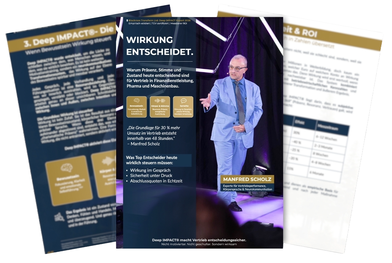 Deep IMPACT® ist das Ergebnis von über 40 Jahren Forschung, 10.000+ Trainings und der unbequemen Wahrheit: Die besten Verkäufer sind keine Rhetoriker, sondern Meister ihres Nervensystems.